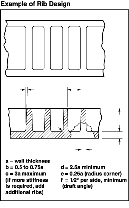 When designing ribs and gussets, it is important to follow the proportional thickness guidelines shown in the Example of Rib Design illustration and the Example of Gusset Design illustration. If the rib or gusset is too thick in relationship to the part wall, sinks, voids, warpage, weld lines (all resulting in high amounts of molded-in stress), longer cycle times can be expected.